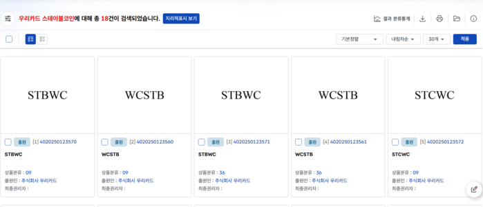 | ▲우리카드가 스테이블코인 관련 상표권 9건을 등록했다. [사진=KIPRIS 지식재산정보검색 서비스 화면 캡처] |