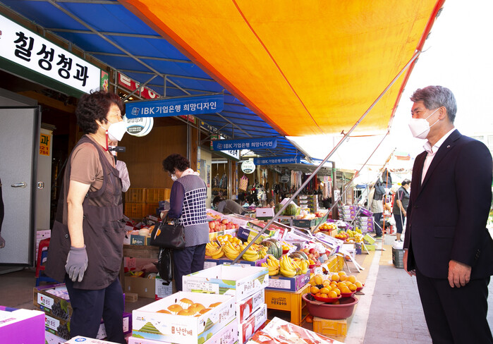 ▲ 윤종원 기업은행장이 28일 'IBK희망디자인' 사업으로 새롭게 탈바꿈한 전남 구례 5일시장에서 과일을 구입하기 전 상인과 이야기를 나누고 있다. [사진=기업은행 제공] |