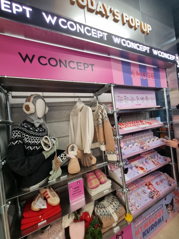 출입구 우측에는 뷰티 브랜드 '어뮤즈'와 패션 플랫폼 'W컨셉'의 프론트로우(최신 트렌드) 의류가 배치됐다. 화장품은 시나몬롤 등 캐릭터 디자인을 통해 관심을 높였고, 립스틱·파운데이션·립밤 등을 갖췄다. 의류는 털신발·스웨터·귀마개 등 겨울 콘셉트에 맞춰 구성했다.