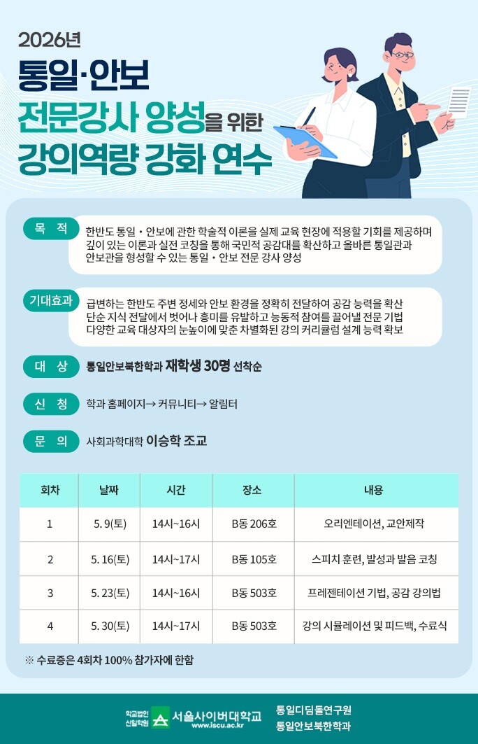 [메가경제=이상원 기자] 서울사이버대학교는 통일디딤돌연구원과 통일안보북한학과 공동 주최로 5월 9일부터 30일까지 4회에 걸쳐 ‘2026 통일안보 전문강사 양성을 위한 강의역량 강화 연수’를 개최한다고 15일 밝혔다.