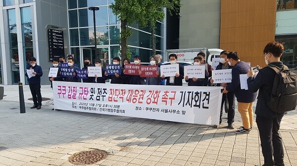 ▲쿠쿠대리점주협의회가 쿠쿠 갑질을 규탄하고 있다[사진=쿠쿠대리점주협의회] |