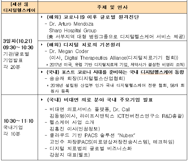 ▲ 21일 열릴 온라인 컨퍼런스 프로그램 '세션3'의 '디지털헬스케어' 주제 및 연사. [출처= 산업통상자원부] |