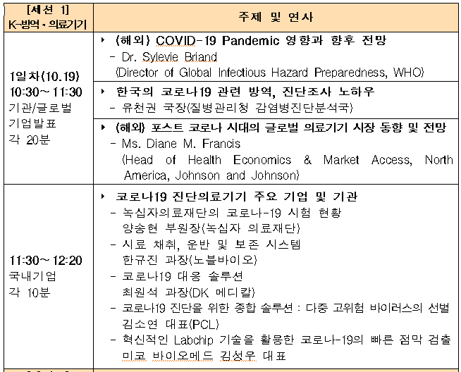▲ 19일 열린 온라인 컨퍼런스 프로그램 '세션1'의 'K-방역ㆍ의료기기' 주제 및 연사. [출처= 산업통상자원부] |
