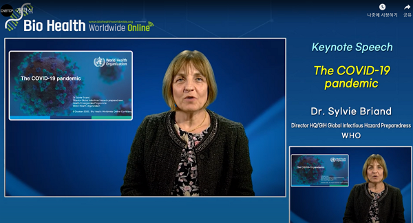 ▲ '코로나19 팬데믹의 영향과 향후 전망'이라는 주제로 기조연설을 하는 실비 브리앙 세계보건기구(WHO) 전염병위기대응국장. [출처= '바이오헬스 월드와이드 온라인' 유튜브 영상 캡처] |