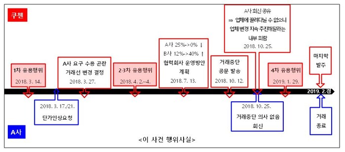 2018년 10월 쿠첸은 A사에 거래중단 공문을 발송했지만, 이에 A사는 거래중단 의사가 없다고 회신했다.