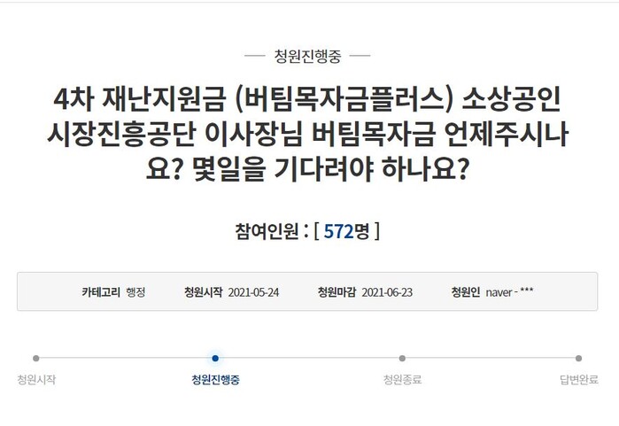 이 게시판에는 문재인 대통령과 소상공인시장진흥공단 이사장이 “버팀목 자금 소상공인에게 신속 지급하겠다”고 한 목소리를 냈다면서, “현재 지켜지고 있다고 생각하시나요?”라고 반문하는 내용으로 시작되는 청원이 지난 24일부터 진행 중이다.