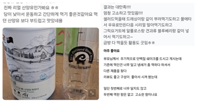 최근 100%에 가까운 산양유 브랜드의 제품을 접한 소비자들은 “전에 먹어봤던 산양유보다 훨씬 맛있다. 너무 간편하고 소화도 잘된다”“우유에 비해 산양유가 좀더 크림같은 맛이 있다”“식감이 매끄러우며 마시기 좋다”“99% 뉴질랜드산 산양유라서 그런지 다른 제품들보다 찬물에 잘 녹고 고소하니 마시기 좋다” 등 긍정적인 반응을 나타냈다.