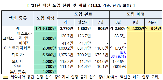 3일 개별 계약된 아스트라제네카 백신 118만2천 회분이 들어올 예정이며, 이를 시작으로 8월에는 약 2860만 회분의 백신이 공급될 예정이다.