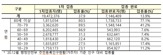연령대별 인구 대비 접종률은 1차 접종 기준으로 60대 86.9%, 70대 89.5%, 80세 이상 80.5%이며, 7월 마지막 주부터 접종이 시작된 50대는 31.3%가 1차접종을 끝냈다.
