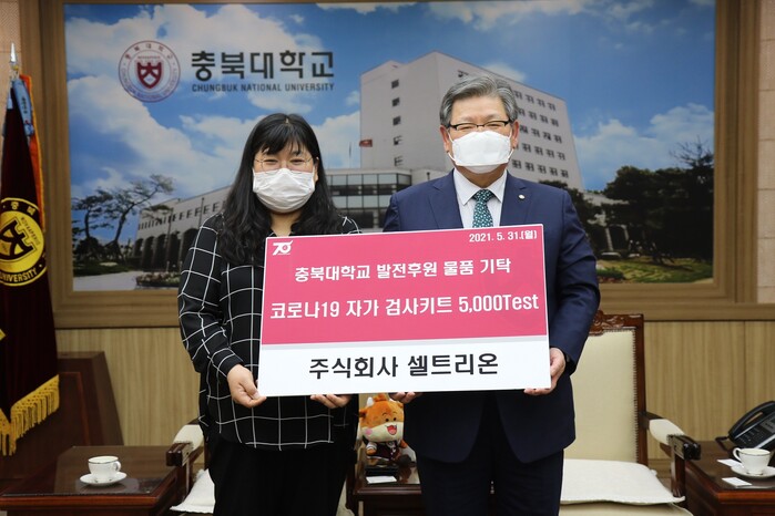 | ▲ 31일 양현주 셀트리온 글로벌SCM본부장이(왼쪽)이 김수갑 충북대학교 총장에게 코로나19 자가검사키트 디아트러스트 홈 테스트 5천개를 전달하고 기념촬영을 하고 있다. [사진=충북대학교 제공] |