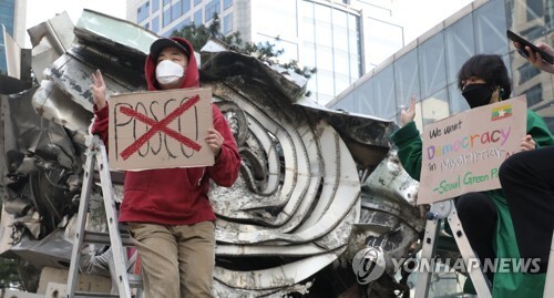 | ▲ 시민·청년단체들이 지난 22일 강남구 포스코센터 앞에서 미얀마 군부와의 관계 청산을 촉구하는 집회를 하고 있다. 이날 집회를 개최한 세계시민선언과 청년기후긴급행동, 서울녹색당은 "포스코는 미얀마 민주주의를 짓밟는 군부와 결탁하고 있다"고 주장했다. [서울=연합뉴스] |