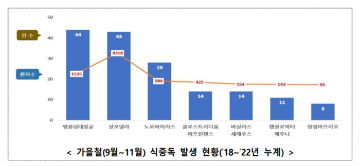 식약처 조사결과 최근 5년간(’18~’22년, ’22년 잠정) 가을철(9월~11월)에 총 341건의 식중독이 발생했고 환자수는 9,236명이었으며, 이 중 병원성대장균, 살모넬라로 인한 식중독이 전체 발생의 26%(87건, 5,853명)를 차지하는 것으로 분석됐다.