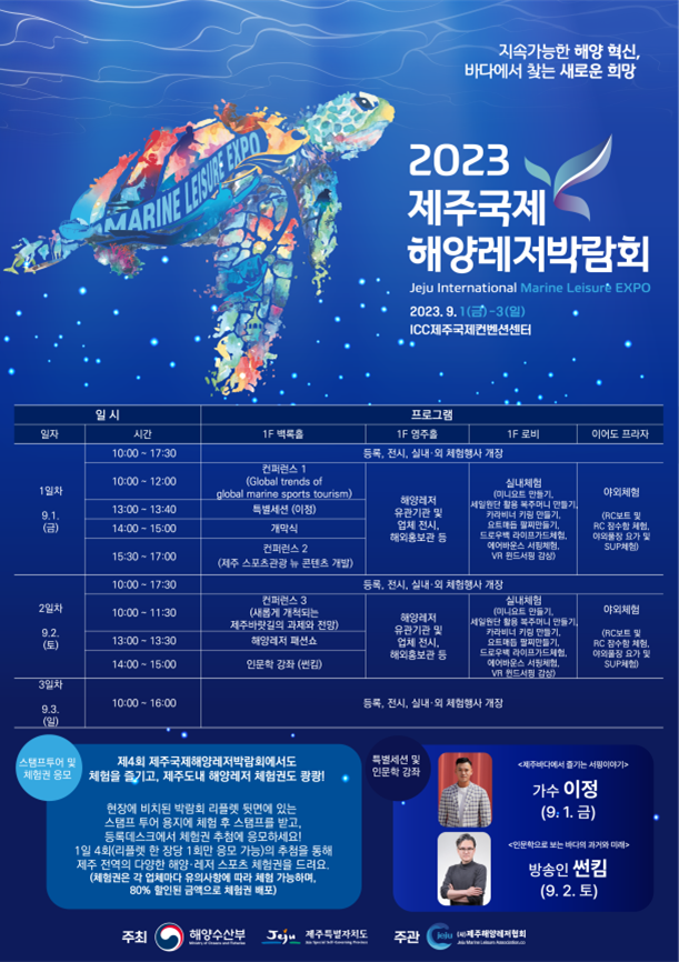 해양수산부(장관 조승환)와 제주특별자치도(도지사 오영훈)가 공동 주최하는 ‘제4회 제주국제해양레저박람회’가 9월 1일(금)부터 9월 3일(일)까지 3일간 제주국제컨벤션센터와 제주도 일원에서 열린다.