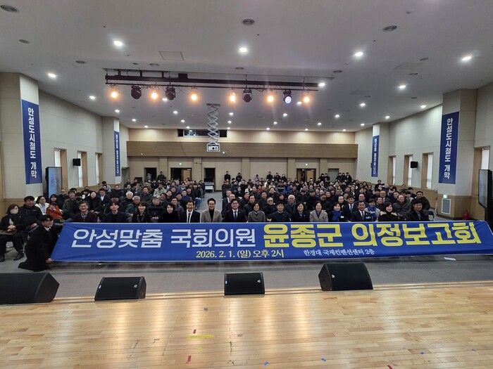 [메가경제=문기환 기자] 더불어민주당 윤종군 국회의원(경기 안성시)이 지난 1일 한경국립대학교 국제컨벤션센터에서 의정보고회를 열고 2025년 의정활동과 지역 현안 성과와 2026년 안성 발전 핵심 과제 등을 발표했다. 이날 행사에는 약 800여 명의 주민이 참석했다.