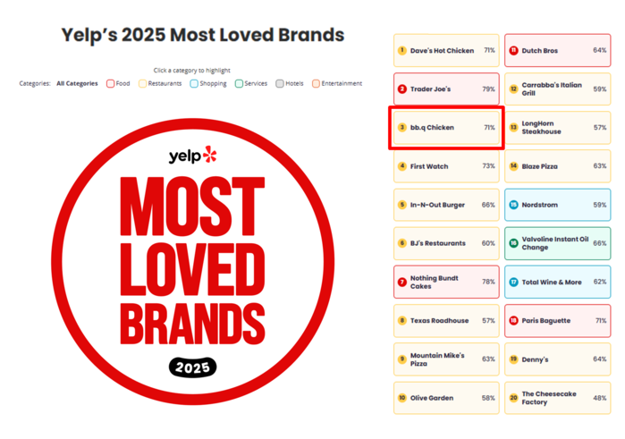 이번 옐프가 발표한 ‘가장 사랑받는 브랜드’ 순위는 브랜드 평점, 재방문 고객 평가, 브랜드 검색량, 리뷰 수 등을 종합 분석해 선정됐다. BBQ는 이 평가에서 높은 소비자 만족도와 브랜드 호감도를 인정받으며 전체 3위에 올랐다.