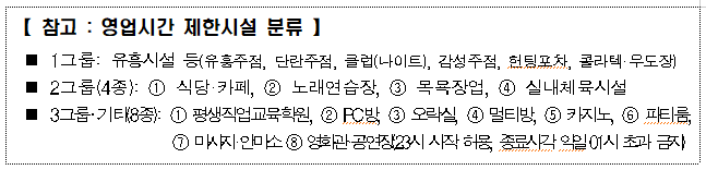 1그룹에는 유흥주점·단란주점, 클럽(나이트), 감성주점, 헌팅포차, 콜라텍·무도장이, 2그룹에는 식당·카페, 노래연습장, 목욕장업, 실내체육시설이, 3그룹 및 기타 시설에는 평생직업교육학원, PC방, 오락실, 멀티방, 카지노, 파티룸, 마사지·안마소, 영화관·공연장이 각각 포함된다.