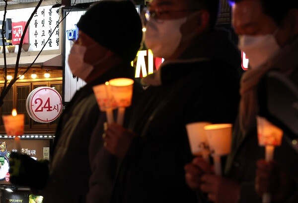 ▲ 지난달 21일 오후 서울 마포구 홍대입구역에서 코로나 피해 자영업 총연대(코자총) 관계자들이 영업 시간 제한 철폐와 자영업자 손실보상을 요구하며 촛불 문화행사를 하고 있다. [사진=연합뉴스]