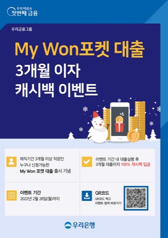 우리금융지주의 자회사 우리은행(은행장 권광석)은 직장인 대상 모바일전용 신용대출인‘My Won 포켓 대출’상품 출시를 기념해 3개월 이자를 돌려주는 이벤트를 내년 2월 28일까지 실시한다고 5일 밝혔다.