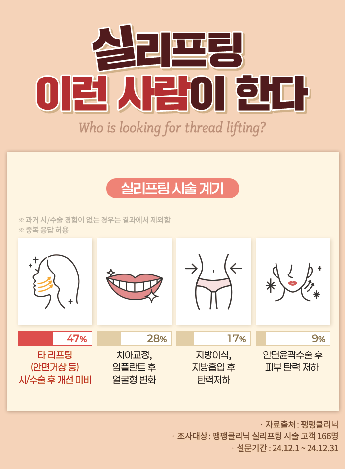 실리프팅 특화 의료기관 팽팽의원(팽팽클리닉)이 2024년 12월 1일~31일 방문 고객 166명을 대상으로 실시한 ‘실리프팅 시술 이유’에 대한 설문조사 결과를 공개했다.