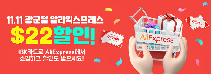 기업은행에 따르면 기업은행 마스터카드 브랜드 소지 회원이 광군제와 블랙프라이데이 기간에 알리익스프레스에서 미화 기준 50달러 이상 구매 하면 22달러를 즉시 할인 받을 수 있다.