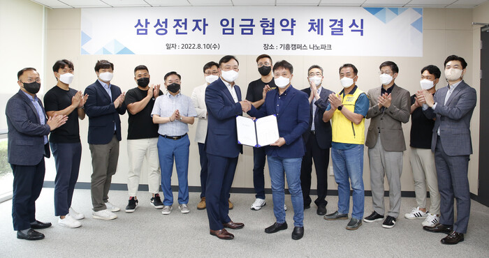 삼성전자는 10일 오전 경기 용인 기흥캠퍼스 나노파크에서 최완우 DS부문 인사팀장(부사장)과 신인철 교섭대표(상무), 노조 공동교섭단 김항열 위원장과 이재신 위원장, 김성훈 위원장, 손우목 부위원장 등 4개 노조 대표가 참석한 가운데 ‘2021·2022년 임금협약’을 체결했다고 밝혔다.