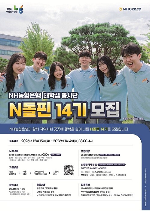 농협은행 담당자는 “농협은행과 함께 지역사회 곳곳에 행복을 실어 나르는 엔도르핀 역할을 할 N돌핀 14기 모집에 많은 관심을 바란다”고 말했다.