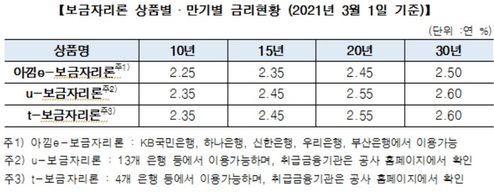 이에 HF공사 홈페이지를 통해 신청하는 ‘u-보금자리론’과 은행 창구에서 신청하는 ‘t-보금자리론’은 대출만기에 따라 연 2.35%(만기 10년)∼2.60%(30년)로 이용할 수 있다. 또 전자약정 등 온라인으로 신청해 비용이 절감되는 ‘아낌e-보금자리론’은 0.10%포인트 낮은 연 2.25%(10년)∼2.50%(30년)의 금리가 적용된다.