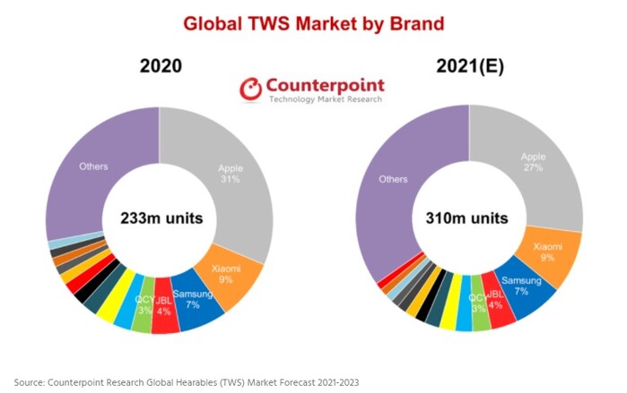 4일 글로벌 시장조사 업체 카운터포인트리서치의 ‘글로벌 무선이어폰 시장 전망 보고서(Hearables Market Forecast)’에 따르면, 올해 TWS 시장점유율은 1위 애플 27%, 2위 샤오미 9%의 뒤를 이어 삼성전자가 7%로 3위에 위치해 있다.