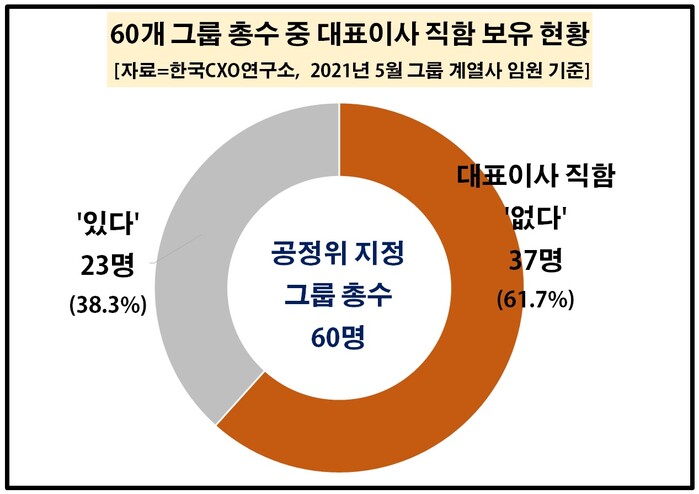 반면에 60명의 총수 중 37명(61.7%)은 그룹 내에서 대표이사 직책을 맡고 있지 않은 셈이다.