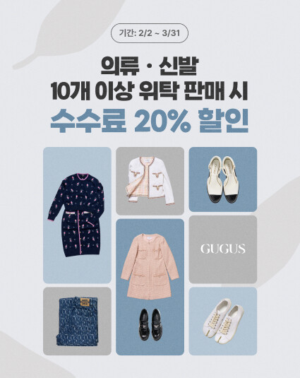 구구스는 고객들의 수수료 부담을 낮추고 보다 효율적인 판매를 돕기 위해 내달 31일까지 약 2개월간 ‘다량접수 이벤트를 운영한다. 이벤트 기간 동안 하이엔드 브랜드 의류 및 신발류를 10개 이상 위탁 접수할 경우 판매 수수료 20% 할인 혜택을 제공한다.(단, 키즈 상품은 이벤트 대상에서 제외, 기본 수수료는 할인 적용 대상에서 제외)