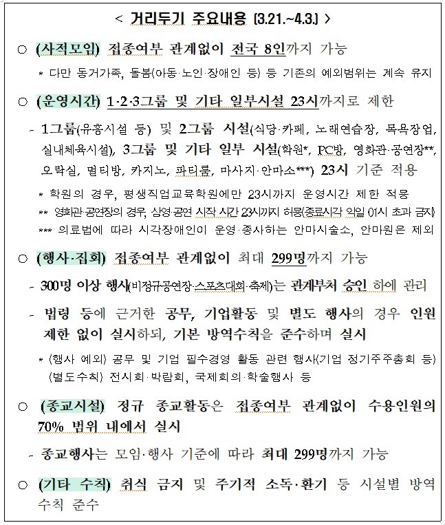 또 행사·집회 등에 대한 조치도 종전 기준이 그대로 시행된다. 접종 여부와 관계없이 최대 299명까지 참여가 가능하고, 300명 이상 행사는 관계부처 승인 아래 관리한다.