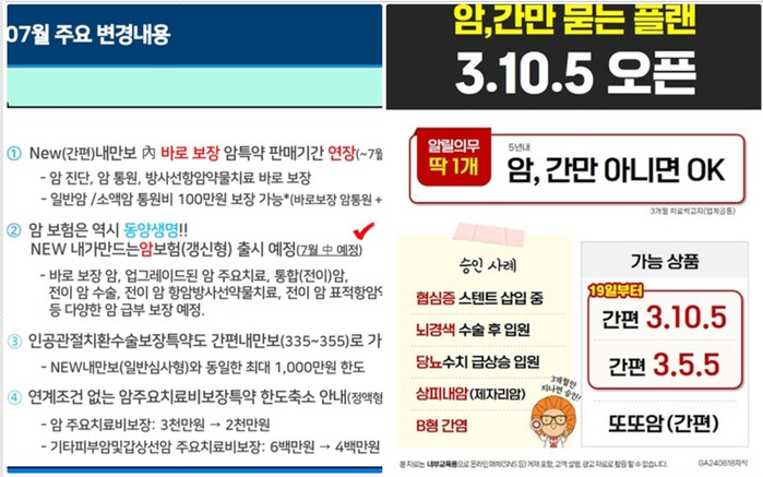 | ▲ <왼쪽부터> 동양생명 '간편 내만보'바로 보장 특약 상품 소식지 안내, 메리츠화재 간편고지형 3.10.10 상품 안내. |