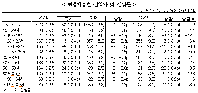 ▲ 연간 연령계층별 실업자 및 실업률. [출처= 통계청] |