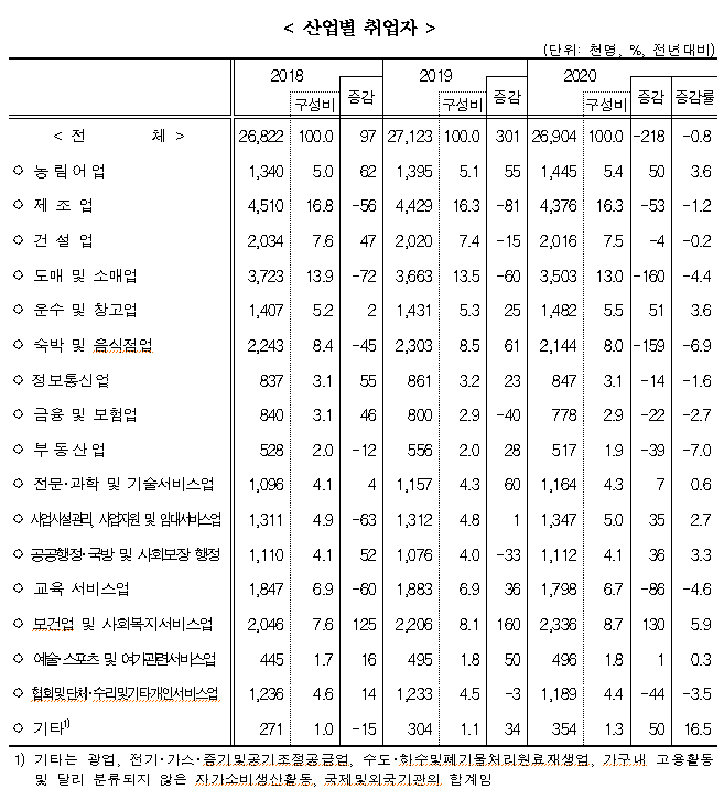 ▲ 2018~2020년 산업별 취업자. [출처= 통계청] |