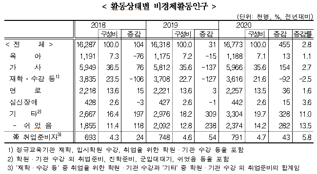 비경제활동인구는 전년 같은달에 비해 모두 69만명 증가했다. 육아(-2만 5천명) 등에서 줄었으나, 가사(32만 9천명), 쉬었음(31만 4천명) 등에서 늘었다.