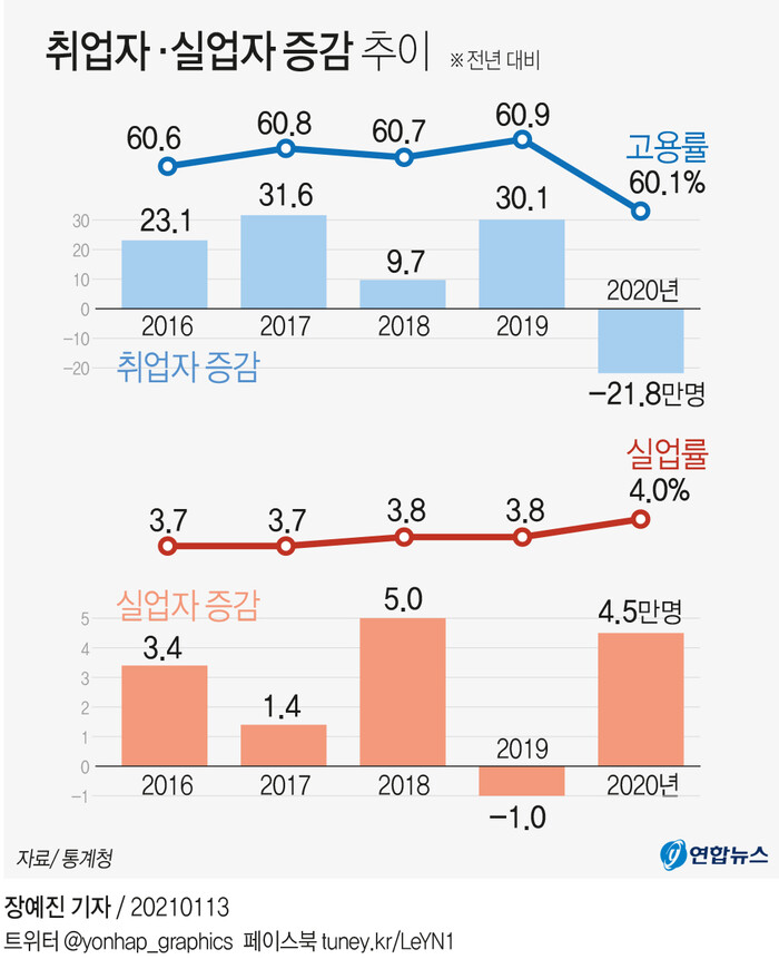 지난해 취업자 수는 코로나19 영향이 시작된 3월부터 12월까지 10개월 연속으로 전년대비 감소했다. 이는 1998년 1월부터 1999년 4월까지 16개월 연속 감소한 이후 최장기간이다.