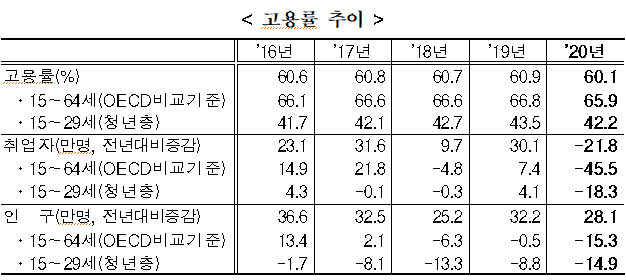 실업률이 오르며 고용률은 0.8%포인트 하락한 60.1%로 낮아졌다. 2013년(59.8%) 이후 최저치다.
