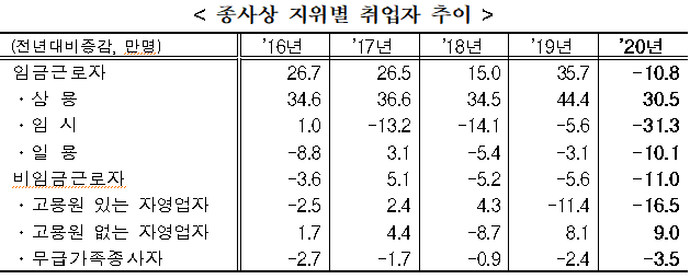 작년 한해 종사상 지위별 취업자를 보면, 임금근로자(-10만8천명)와 비임금근로자(-11만명) 모두 감소했다.