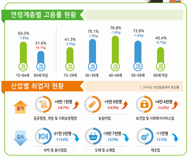 반면 공공행정·국방및사회보장행정(9만 1천명), 농림어업(5만 9천명), 보건업및사회복지서비스업(4만 4천명) 등에서는 늘었다.