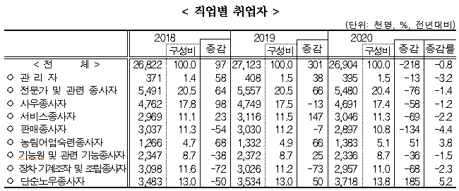 ▲ 2018~2020 직업별 취업자. [출처= 통계청] |