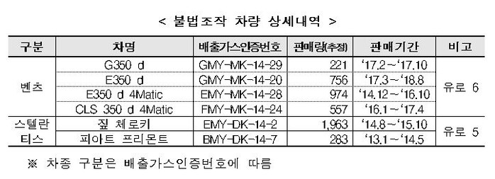 해당 차종은 지난 2013년부터 2017년까지 판매된 차량으로, G350d, E350d, E350d 4matic, CLS350d 4matic 등 벤츠 4종, 짚 체로키, 피아트 프리몬트 등 스텔란티스 2종이다.