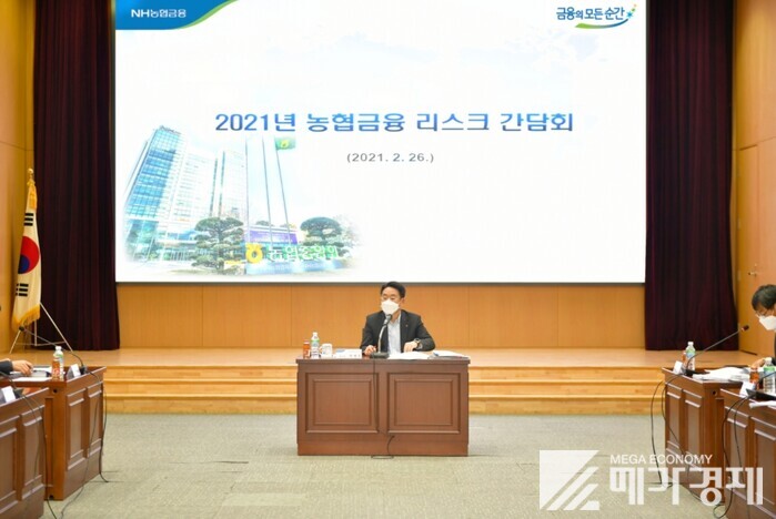 | ▲ 지난 2월 26일, 서울 중구 소재 농협금융지주 본사 회의실에서 개최된 ‘2021년 리스크 간담회’에서 반채운 농협금융 리스크관리부문장이 참석자들에게 당부말을 전하고 있다. [사진=NH농협금융지주 제공] |