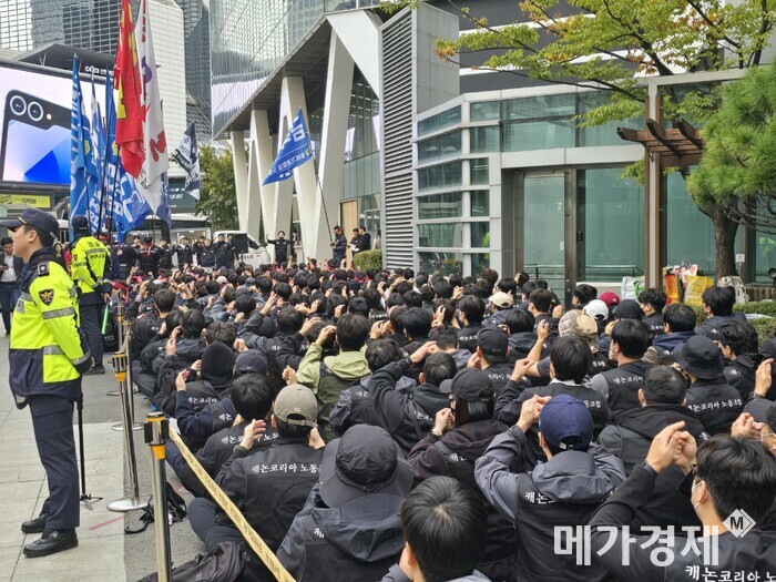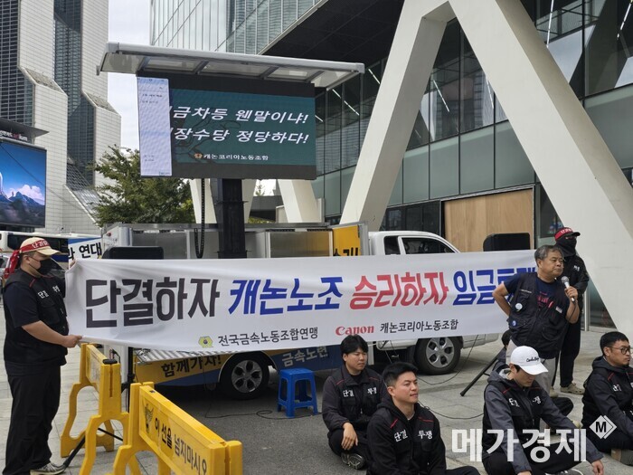 | ▲29일 정오, 전국금속노동조합연맹 캐논코리아노동조합(이하 캐논노조)이 삼성동 캐논K타워 앞에서 임금협상안 체결 촉구 파업집회를 개최했다.[사진= 메가경제] |