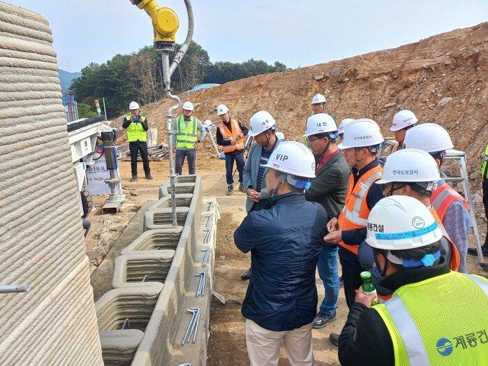 [메가경제=장준형 기자] 한국도로공사(사장 함진규)는 하이시스(주)(대표이사 정구섭), 동아이엔지(주)(대표이사 강덕만)와 함께 국내 최초로 3D Concrete Printing(이하 3DCP) 기술을 적용해 높이 3m, 연장 25m의 토목구조물(옹벽)을 성공적으로 시공했다고 16일 밝혔다.