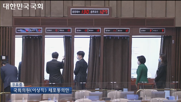 ▲ 21일 오후 국회 본회의에서 무소속 이상직 의원의 체포동의안이 통과되고 있다. [사진= 국회 인터넷의사중계시스템 캡처] |