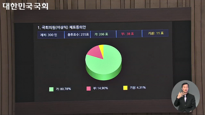 국회는 21일 오후 본회의에서 이 의원에 대한 체포동의안을 무기명 투표로 진행, 재적의원 300명 중 255명이 표결에 참여한 가운데 찬성 206표, 반대 38표, 기권 11표로 통과시켰다.