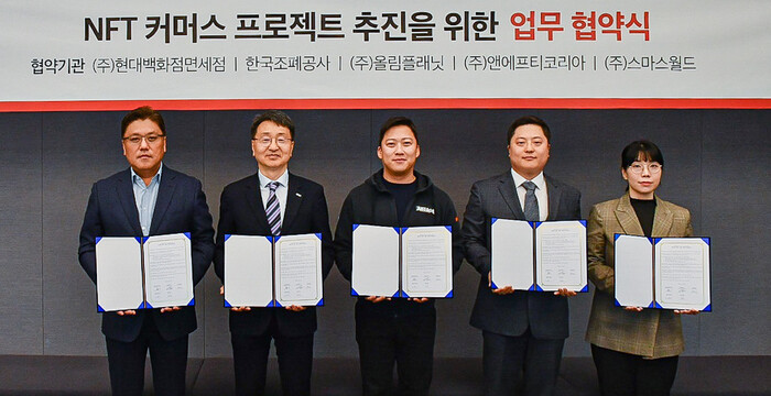 현대백화점면세점은 서울 삼성동 파르나스타워 올림플래닛 본사에서 한국조폐공사와 디지털 아트 기업 ‘스마스월드’, 메타버스 전문 기업 ‘올림플래닛’, NFT 콘텐츠 전문 기업 ‘앤에프티코리아’와 함께 NFT 아트 작품 제작·유통 협력 ‘NFT 커머스 프로젝트’ 추진을 위한 다자간 업무협약(MOU)을 체결했다고 10일 밝혔다.