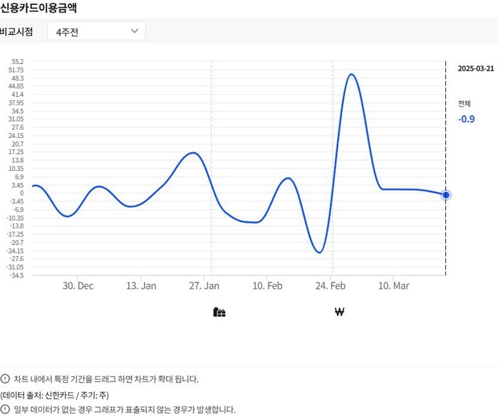 지난 8일 통계청 나우캐스트를 보면 3월 셋째 주(15∼21일) 신용카드 이용금액이 4주 전보다 0.9% 줄었다.