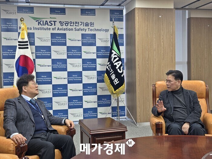 | ▲황호원 항공안전기술원장(왼쪽)과 소대섭 한국항공보안학회장이 항공안전기술원에서 본지 단독 진행으로 특별대담을 하고 있다. |