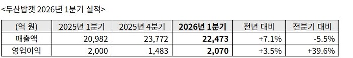 [메가경제=박제성 기자] 두산밥캣은 2026년 1분기 사업 부문의 수요 개선에 힘입어 매출은 전년 동기 대비 7.1% 증가한 2조2473억 원, 영업이익은 3.5% 증가한 2070억 원으로 나타났다고 28일 밝혔다.